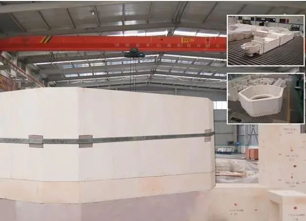 其產(chǎn)品優(yōu)點為:①使用了電熔氧化硅結(jié)合相,不含氧化鈣成分,二氧化硅含量可達(dá)98.5%以上;②密度更小(1.8g/cm3),降低了整個大碹的重量;③價格相比同級別電熔材料更低;④比硅磚具有更低的膨脹系數(shù)(650℃時0.6%)、更高的使用溫度(T0.5為1690℃);⑤更好的體積穩(wěn)定性。在國內(nèi)某全氧燃燒窯爐上有使用經(jīng)歷,但大碹出現(xiàn)威脅到窯爐的變形問題。