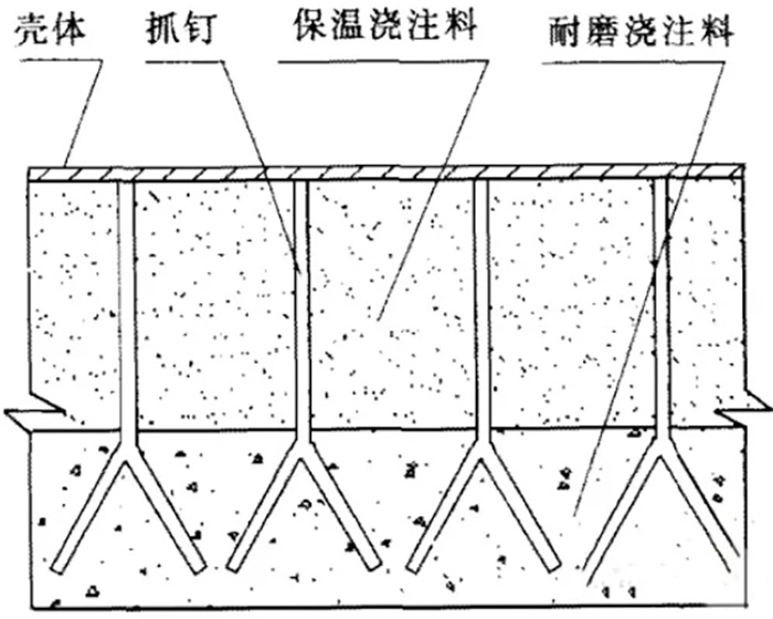 如圖3所示,為耐磨澆注料+保溫澆注料型式,這種結(jié)構(gòu)型式是按一定規(guī)律布置“Y”形抓釘用以固定耐磨襯里,為解決金屬抓釘與耐磨澆注料之間的溫脹差異,抓釘上要涂1mm厚浙青,避免熱態(tài)下由于金屬銷釘與耐火材料的膨脹不同而引起耐火材料的開裂,同時耐磨澆注料需按2%的比例加入不銹鋼纖維,同樣耐磨襯里要留有適當膨脹縫。