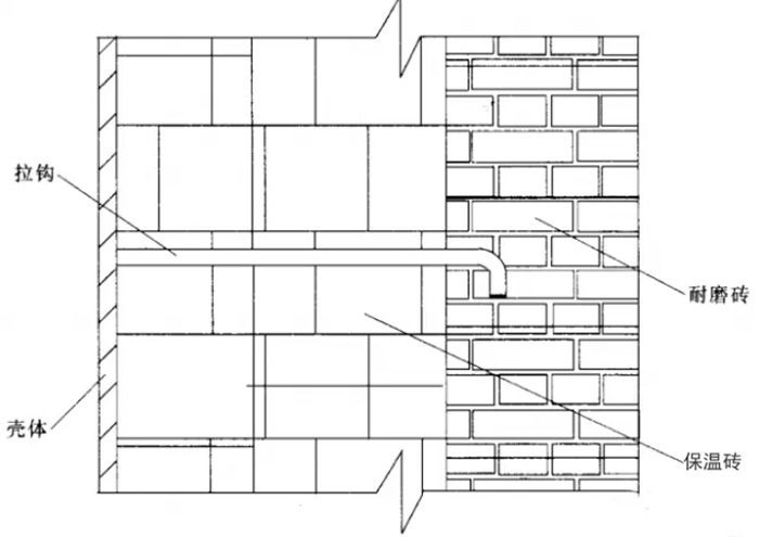 如圖4所示,為耐磨磚襯里+保溫磚型式,為解決膨脹每一定間隔留有膨脹縫,即耐磨磚與耐磨磚之間留有2mm的灰漿縫,耐磨磚分層采用焊在鋼殼上的拉鉤加固,而且為了把耐磨磚的質(zhì)量分層傳遞到鋼殼上,并在適當高度設(shè)有高溫熱強鋼制的托架。這種型式適合大面積平面或圓弧面。