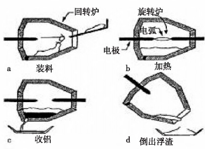 ALUREC法由丹麥阿加公司、霍戈文斯鋁業(yè)公司、曼公司三家公司聯(lián)合開(kāi)發(fā),流程圖見(jiàn)圖4。主要流程為裝料、加熱、收鋁、倒出浮渣,該法主體設(shè)備為回轉(zhuǎn)式熔化爐,還可以用純氧作助燃劑,升溫速度快,可以有效減少燃燒過(guò)程產(chǎn)生的有機(jī)氣體,煙塵被煙罩吸收二次利用處理。此法優(yōu)點(diǎn)在于機(jī)械化程度較高和運(yùn)行環(huán)境好;但金屬回收率要比炒灰低,一般在93%左右,且產(chǎn)生的殘余鋁灰還需進(jìn)一步處理。