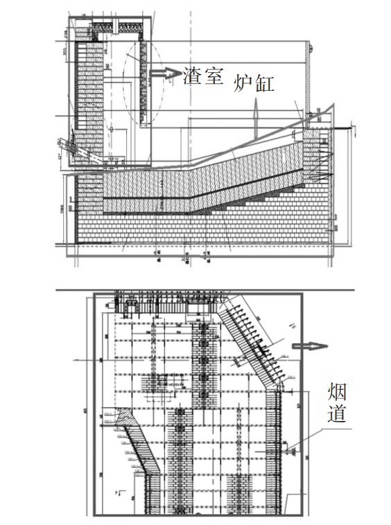 由側(cè)吹爐工作原理可知,側(cè)吹爐爐缸、渣室會受到熔體的侵蝕和沖刷,煙道會受少量熔渣的噴溉侵蝕和含塵煙氣的沖刷。在正常爐況下,這3個區(qū)域的溫度為1100~1300℃;但在爐況不穩(wěn)定情況下,這3個區(qū)域的溫度可達(dá)1400℃以上。在實(shí)際生產(chǎn)過程中,側(cè)吹爐需供入富氧1次風(fēng)和2次風(fēng),并在局部形成強(qiáng)氧化氣氛,因此側(cè)吹爐應(yīng)選擇不易被氧化的耐火磚。熔渣的主要成分為FeO、SiO?、CaO、AI?O?,高鋁質(zhì)耐火材料和硅石耐火材料會參與造渣,不適合側(cè)吹爐使用。因此,側(cè)吹爐耐火材料需要具備耐高溫、熱穩(wěn)定性強(qiáng)、荷重變形溫度高、耐壓強(qiáng)度高、抗氧化性、不參與造渣的特點(diǎn)。結(jié)合耐火材料的特性,側(cè)吹爐應(yīng)選擇鎂質(zhì)耐火材料。鎂質(zhì)耐火材料中Cr?O?的含量増加可以提高材料的抗渣侵蝕性,因此側(cè)吹爐爐缸、渣室和煙道的耐火磚選擇Cr?O?含量較高的鎂鉻質(zhì)耐火材料。