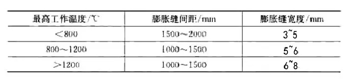 ②現(xiàn)場(chǎng)澆注的爐體?,F(xiàn)場(chǎng)澆注的耐火澆注料爐體留設(shè)膨脹縫的間距和寬度??蓞⒖急?所示。表中數(shù)值適用于黏土質(zhì)和高鋁質(zhì)耐火澆注料。