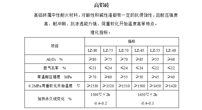 高鋁磚相關(guān)理化指標(biāo):